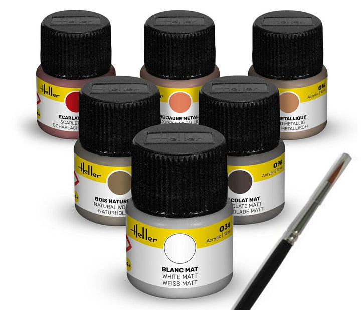This set contains six 12 ml acrylic colours and a brush. Colours included:
