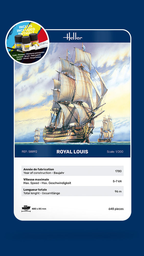 Es ist der Hilfsbereitschaft des SERVICE HISTORIQUE DE LA MARINE in PARIS zu verdanken, die ihre Archive für die Techniker der Firma HELLER geöffnet hatten, dass die Rekonstruktion der ROYAL LOUIS möglich war. Das Design des Rumpfes, die Verteilung der Artillerie und der Takelage wurden aus einem Entwurf des Grafen von Estaing vom 25. September 1772 übernommen. Die Baupläne wurden von Herrn J.B. OLIVIER, berühmt für seine Schiffsarchitektur, erstellt. Die Royal Louis war ein Großsegler erster Klasse. Sie war mit 120 Kanonen ausgerüstet, davon 32 St. vom Kaliber 36, von denen jede fast 5 Tonnen wog. Sie gehörte zu den größten Kriegsschiffen ihrer Zeit. Namensgeber war der französische König Louis XVI. Ihre Länge an der Wasserlinie betrug 68 m, die Gesamtlänge 96 m und die Höhe des Hauptmastes vom Kiel bis zur Plattform betrug 74 m. In den Jahren 1779-1780 war die Royal Louis ein Hauptschiff des Blau-Weiß-Geschwaders, das zum Geschwader von Amerika genannt, Graf von Estaing gehörte. Dieses Schiff war außergewöhnlich aufgrund seiner Formen und vor allem für den Reichtum, der Finesse und der Eleganz seines Hecks, deren Balkone wahre Meisterwerke waren. Sie erlitt 1794 in der Nähe von Brest Schiffbruch und sank.